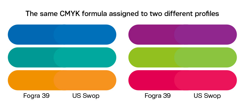 The colour management settings in your app is where you assign a colour profile to your design. When you change the profile, the representation on your screen will change. The formula hasn't changed, only the way it is displayed. The colour profile describes how the colour model formula should look. To have the colour stay the same over multiple colour profiles, the formula will have to be adjusted accordingly for each individual profile. A colour profile is mandatory for accurate colour matching.