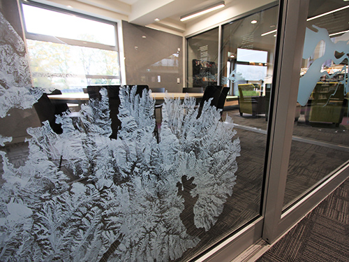 Optically clear film imaged with white ink only - applied to glass.