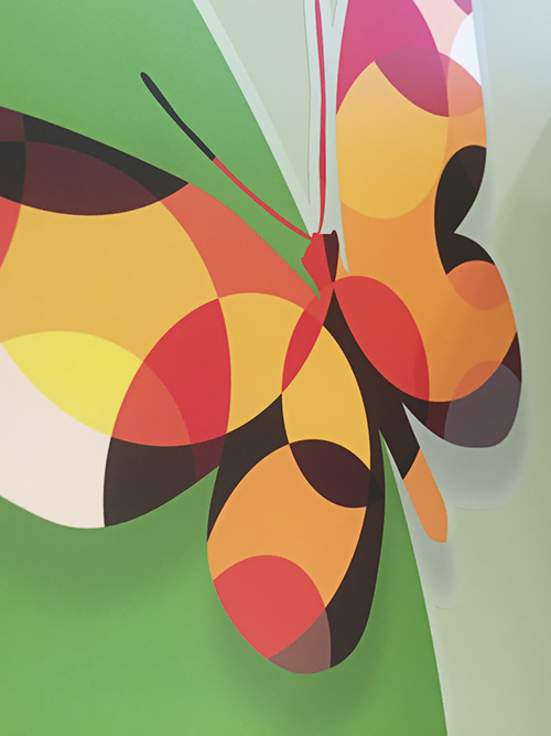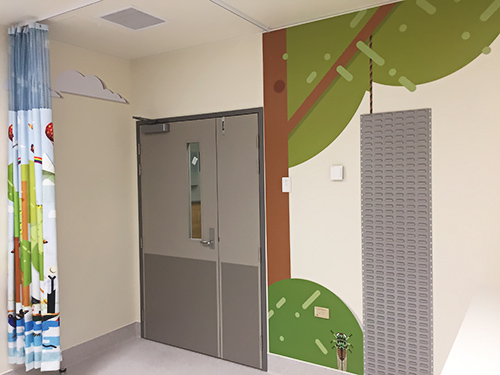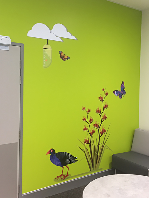 This is the livery we added to the Greymouth hospital paediatric ward. The themed laminated graphics are printed onto self-adhesive vinyl and then cut to shape using a digital cutter. Because of the design, we were required to match the paint colours used on the walls and print the edges so the graphics seamlessly combine with the walls.