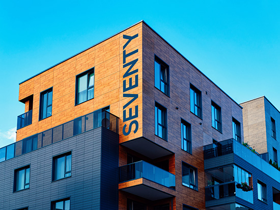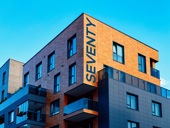 Check out this building. We have made two examples (well four actually). Text running up, text running down, and to make it a little interesting, flipped the building so there is a change of the apparent margin from right to left. What we found interesting (and unexpected), is that 'up' works on one, and 'down' on the other. We had a preconceived idea that one direction would look better than the other in both cases.