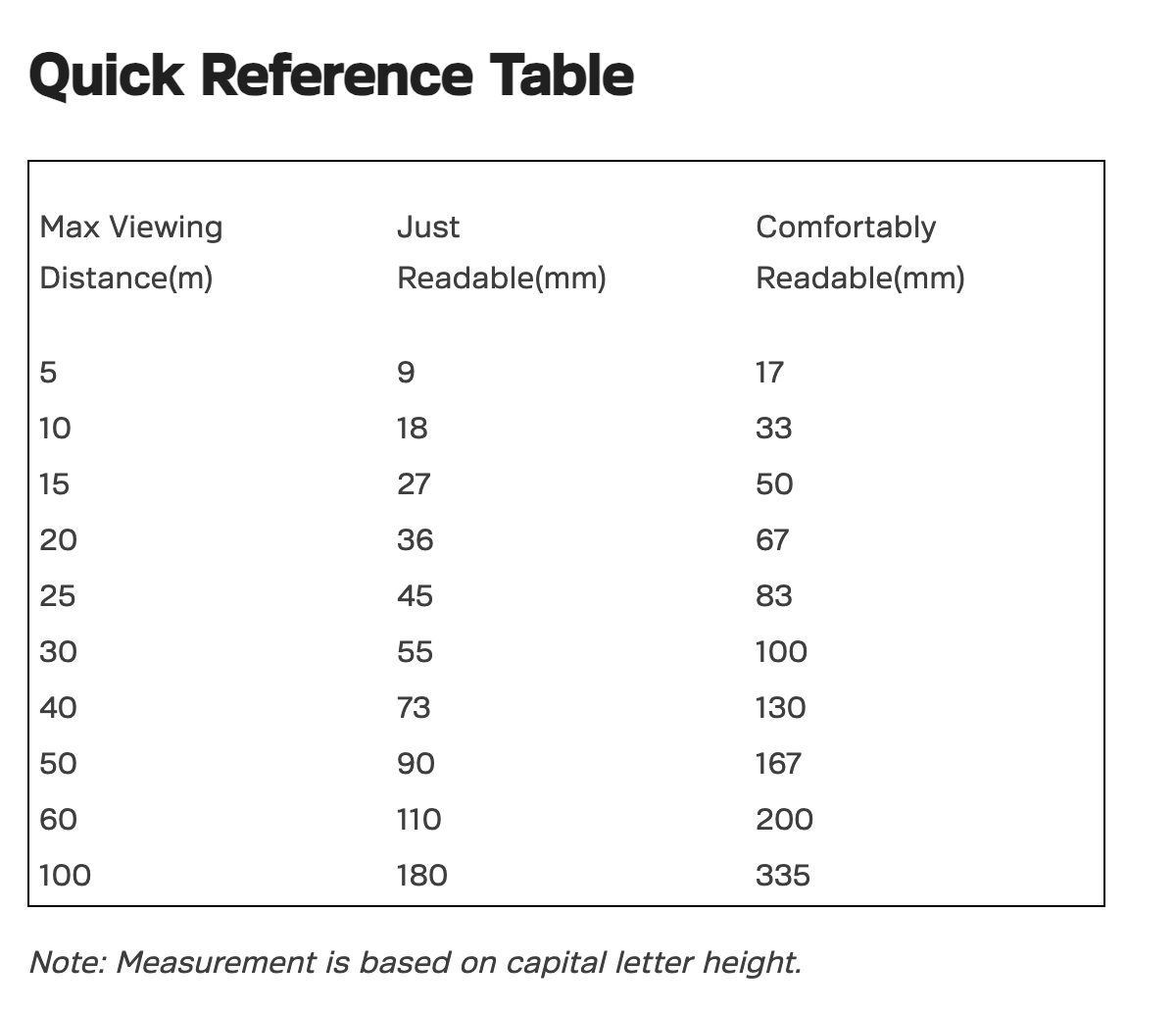 Example: A sign viewed at 10m should have letters at least 18mm high to be just readable, or 33mm high to be comfortably readable.