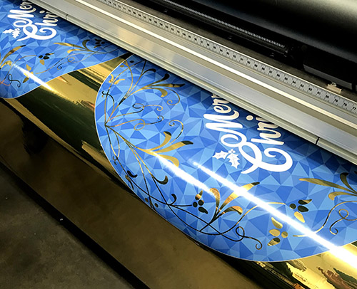 Fresh off the printer - Custom printed Christmas decorations on gold foil.