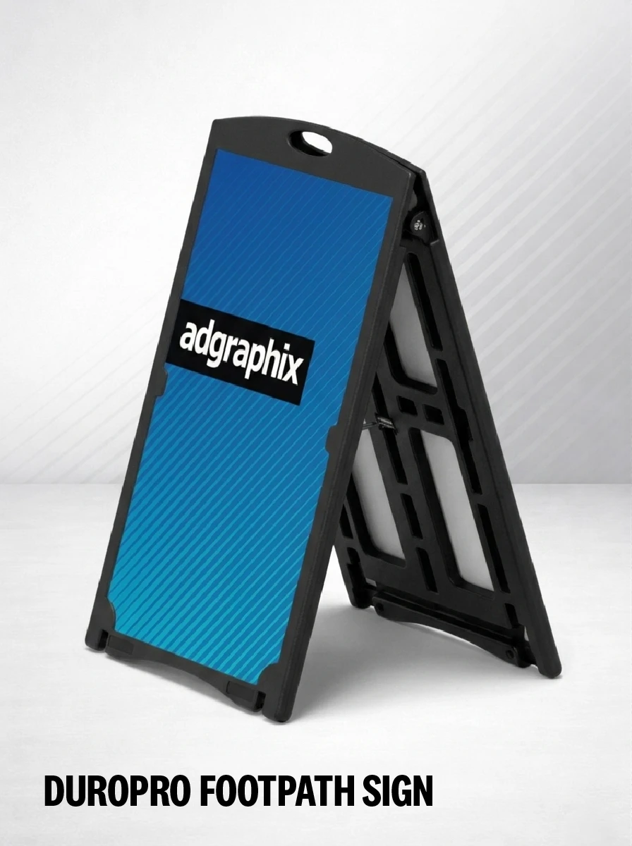 The Duropro Display is a modern looking A-frame style footpath sign. Designed for all conditions it is suitable for indoor or outdoor use. Rigid sign panels are held in place with moulded tabs